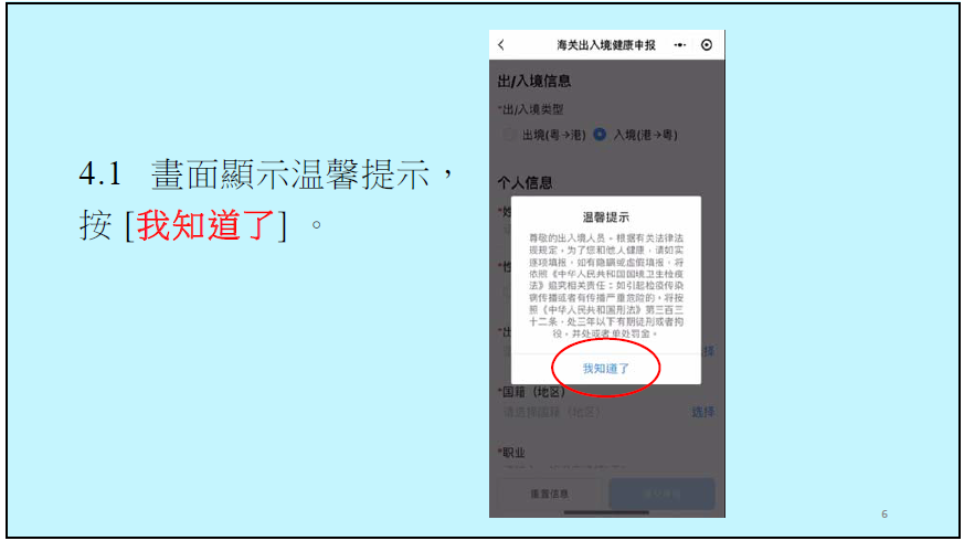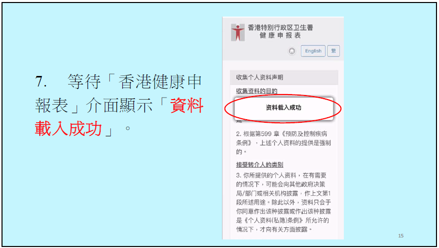 三、等待“香港健康申報表”介面顯示“資料載入成功”,然後在“收集個人資料聲明”頁面按“下一步”。在“健康申報表”頁面按照指示填寫及提交入境所需資料。