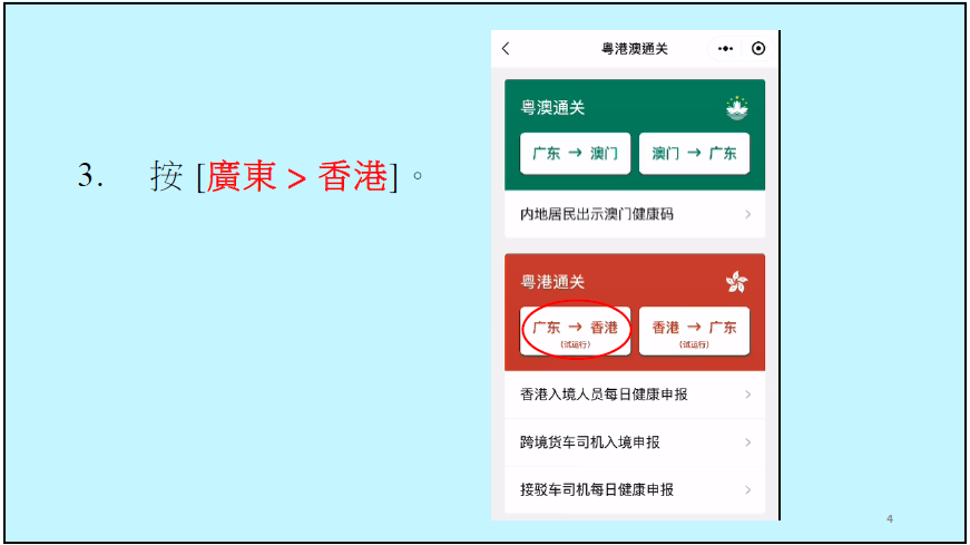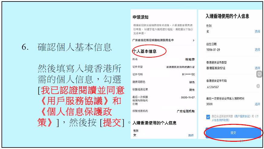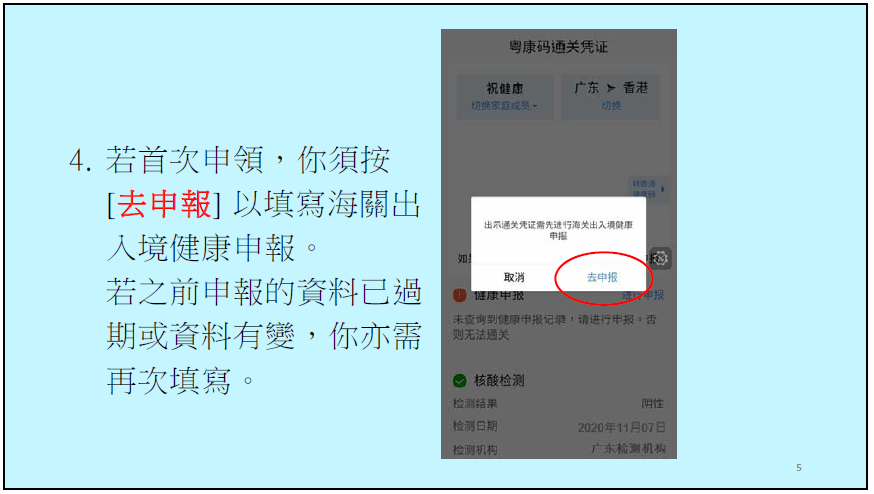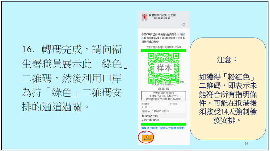 香港居民要從廣東省或澳門出發回香港,申請人需要在抵港前24小時,利用由在廣東省、澳門獲認可的檢測機構發出的有效核酸陰性檢測結果轉換健康碼,檢測要在回港前3日內才有效。