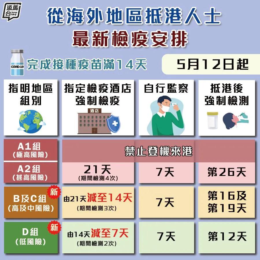 海外地區分為A1組:極高風險地區、A2組:甚高風險地區、B組:高風險地區、C組:中風險地區,以及D組:低風險地方,若本地及相關海外地區疫情沒有重大轉變,將由5月12日零時零分起調整已接種疫苗人士抵港後的檢疫期。